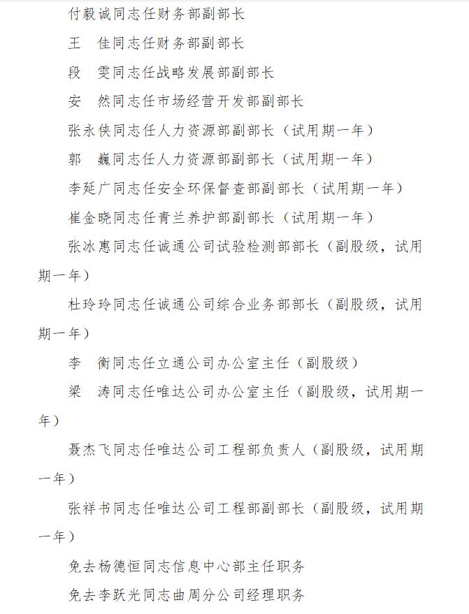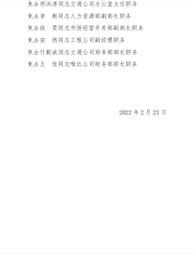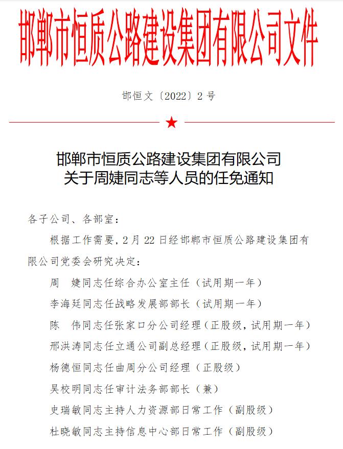 邯鄲市恒質公路建設集團有限公司 關于周婕同志等人員的任免通知